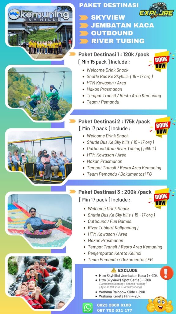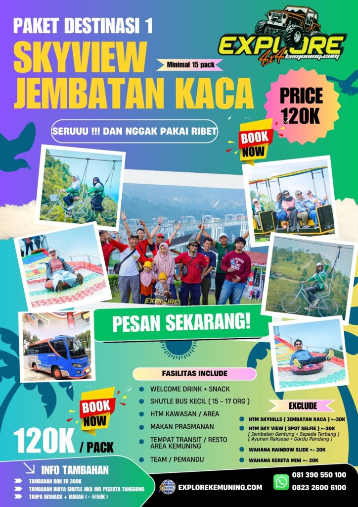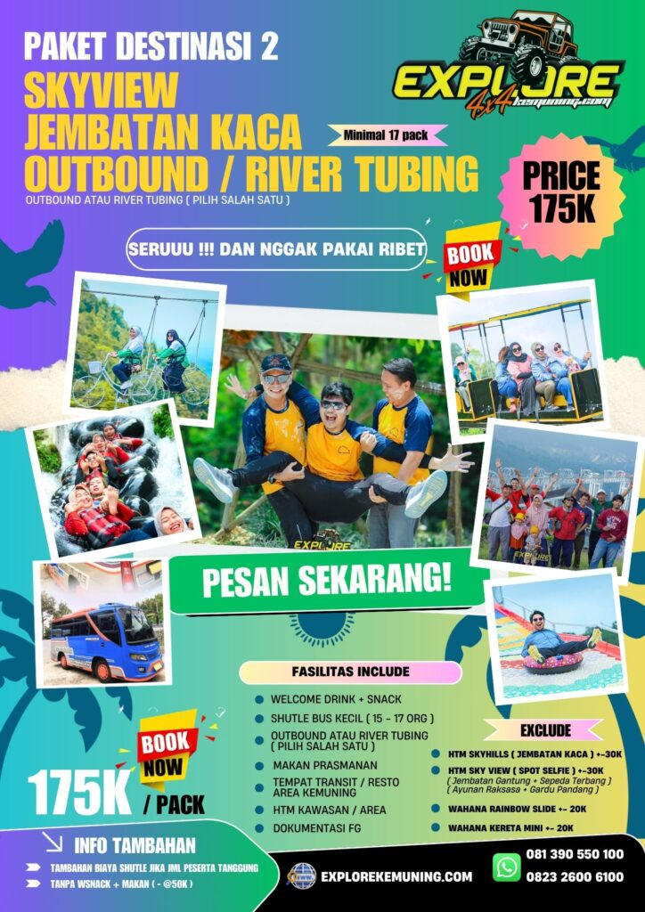 Paket Destinasi Jembatan Kaca / Kemuning Sky Hills dipadukan dengan Outbound dan River tubing. Dijamin liburanmu semakin seru.